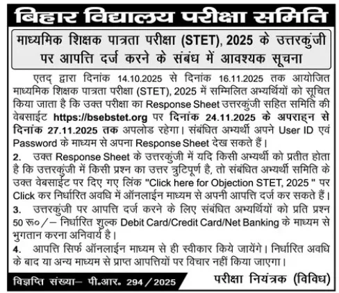 अगर आपने 14 अक्टूबर 2025 से 16 नवंबर 2025 के बीच आयोजित माध्यमिक शिक्षक पात्रता परीक्षा (STET) 2025 में हिस्सा लिया है और अब अपनी आंसर की जारी होने का इंतज़ार कर रहे हैं, तो आपके लिए बड़ी खुशखबरी है। बिहार विद्यालय परीक्षा समिति द्वारा 24 नवंबर 2025 को आपकी STET Answer Key 2025 जारी कर दी जाएगी।